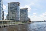 Причал отправления с видом на башни бизнес-центра.